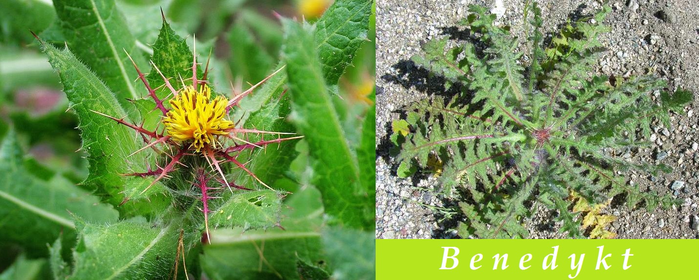 benedykt-ucinky-na-zdravi-co-leci-pouziti-uzivani-vyuzitiBenedykt (správně benedikt) lékařský (čubet), latinsky cnicus benedictus. Léčí poruchy trávení, regulace látkové výměny, nemoci jater a žlučníku. Benedykt je jednoletá až půl metru vysoká chlupatá bylina - bodlák. Lodyhu má vystoupavou až přímou, Shrannou, rýhovanou, často bohatě rozvětvenou. Dole štětinatou, nahoře chlupatou. Listy chlupaté, podlouhlé až kopinaté, hrubě zubaté s trnitě lemovanými úkrojky.