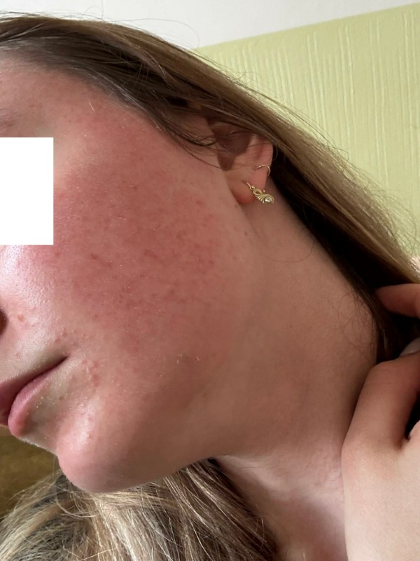 Pravděpodobně se jedná o papulopustulózní formu růžovky (rosacea), která je aktuálně doprovázena silným podrážděním vyvolaným léčbou retinoidem Aklief, což způsobuje narušení kožní bariéry a následnou zánětlivou reakci. Příliš intenzivní čištění pleti nebo používání nevhodných čisticích přípravků může tento stav výrazně zhoršovat, stejně jako hormonální jóga, která zvyšuje prokrvení v obličeji a tím i pocit horka a začervenání.