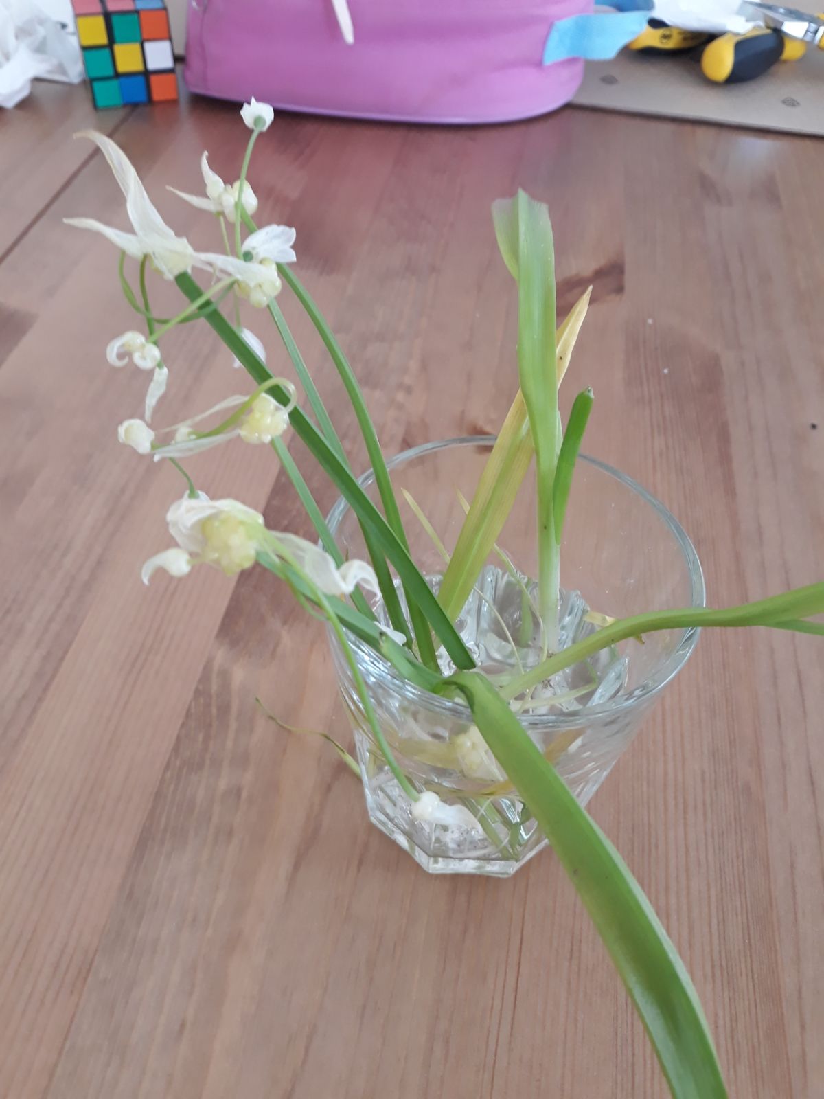 Poznávačka, neznámá rostlina - bílé květy, pokroucená dlouhá blizna (česnek podivný - Allium paradoxum)