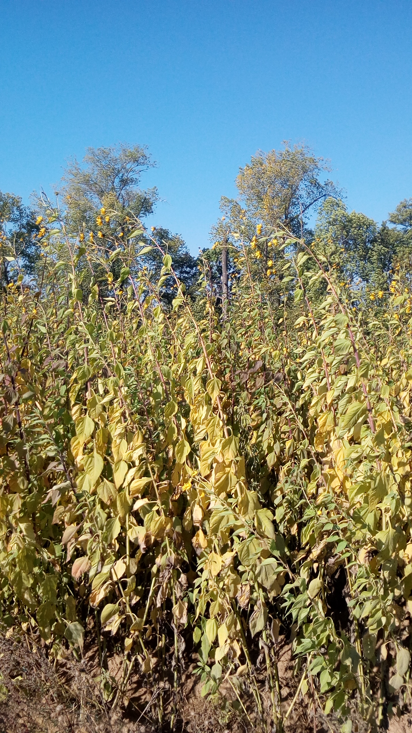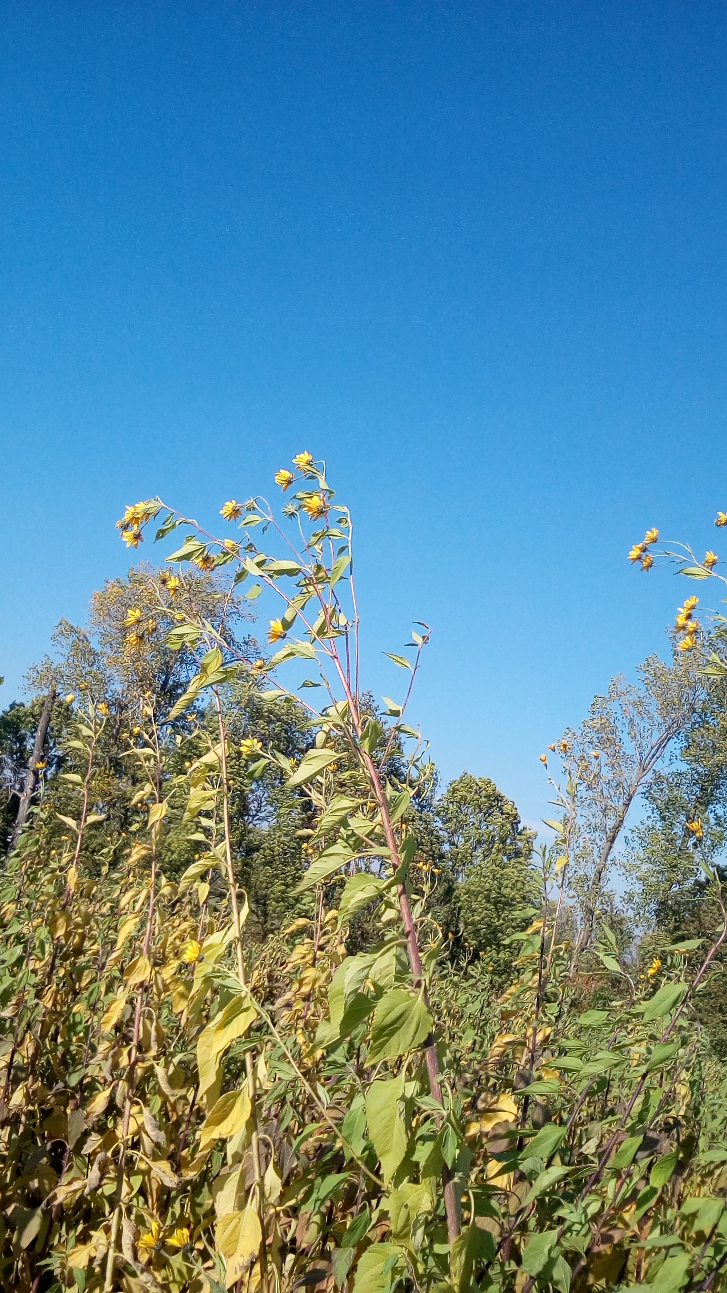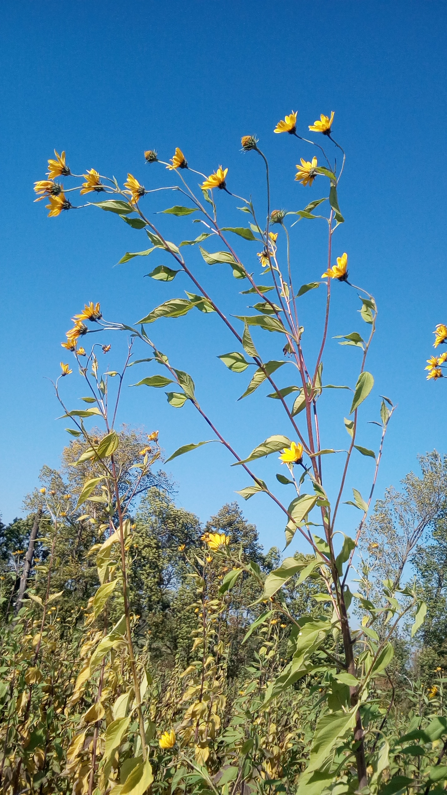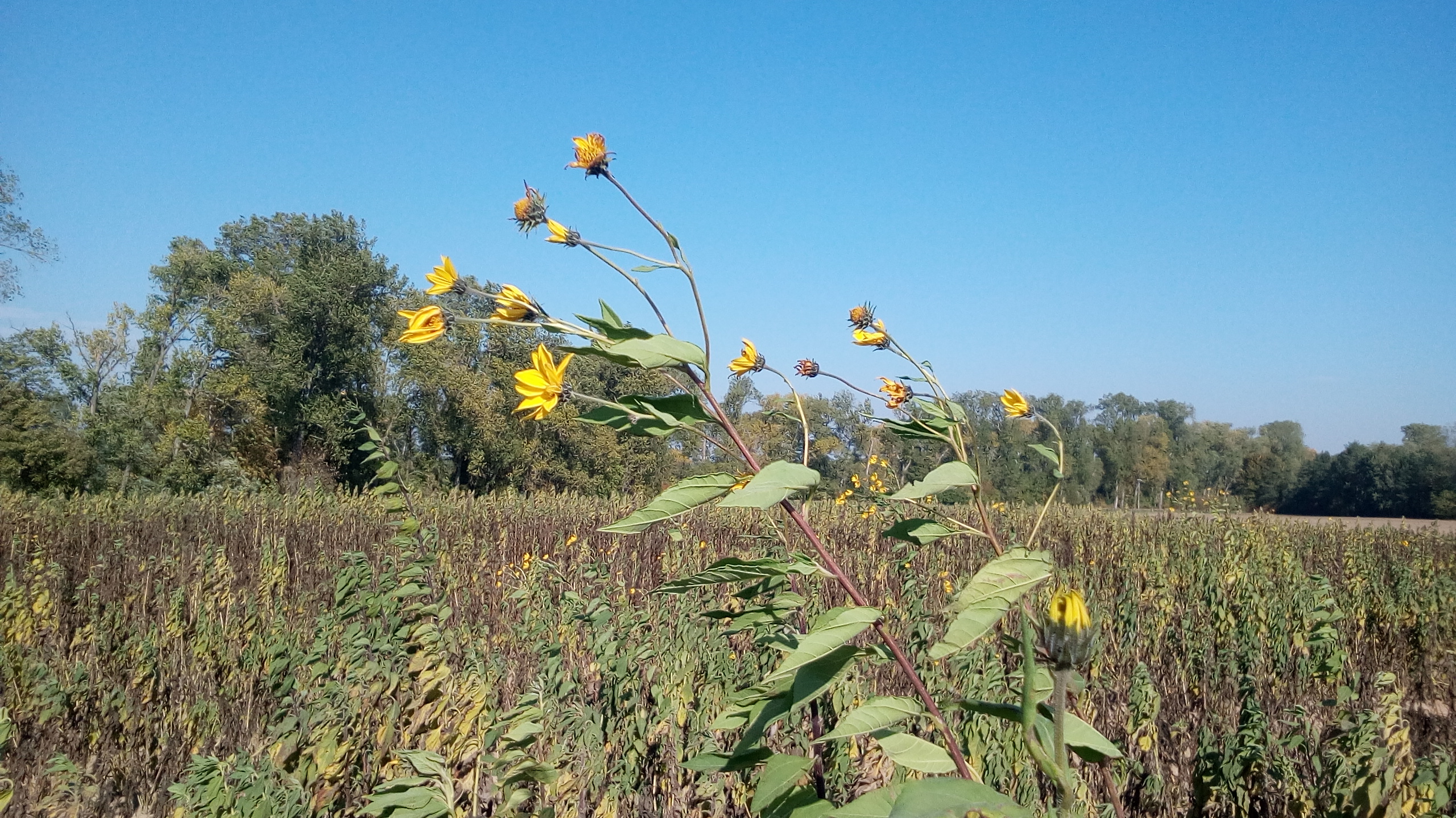 Rostlina u pole se žlutými květy na podzim - slunečnice topinambur, topinambur hlíznatý