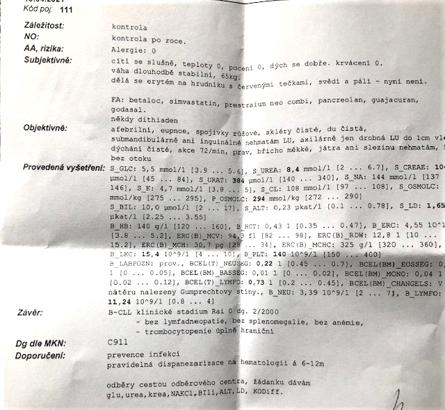 Přikládám seznam léků které užívá a aktuální výsledky vyšetření z hematologie.