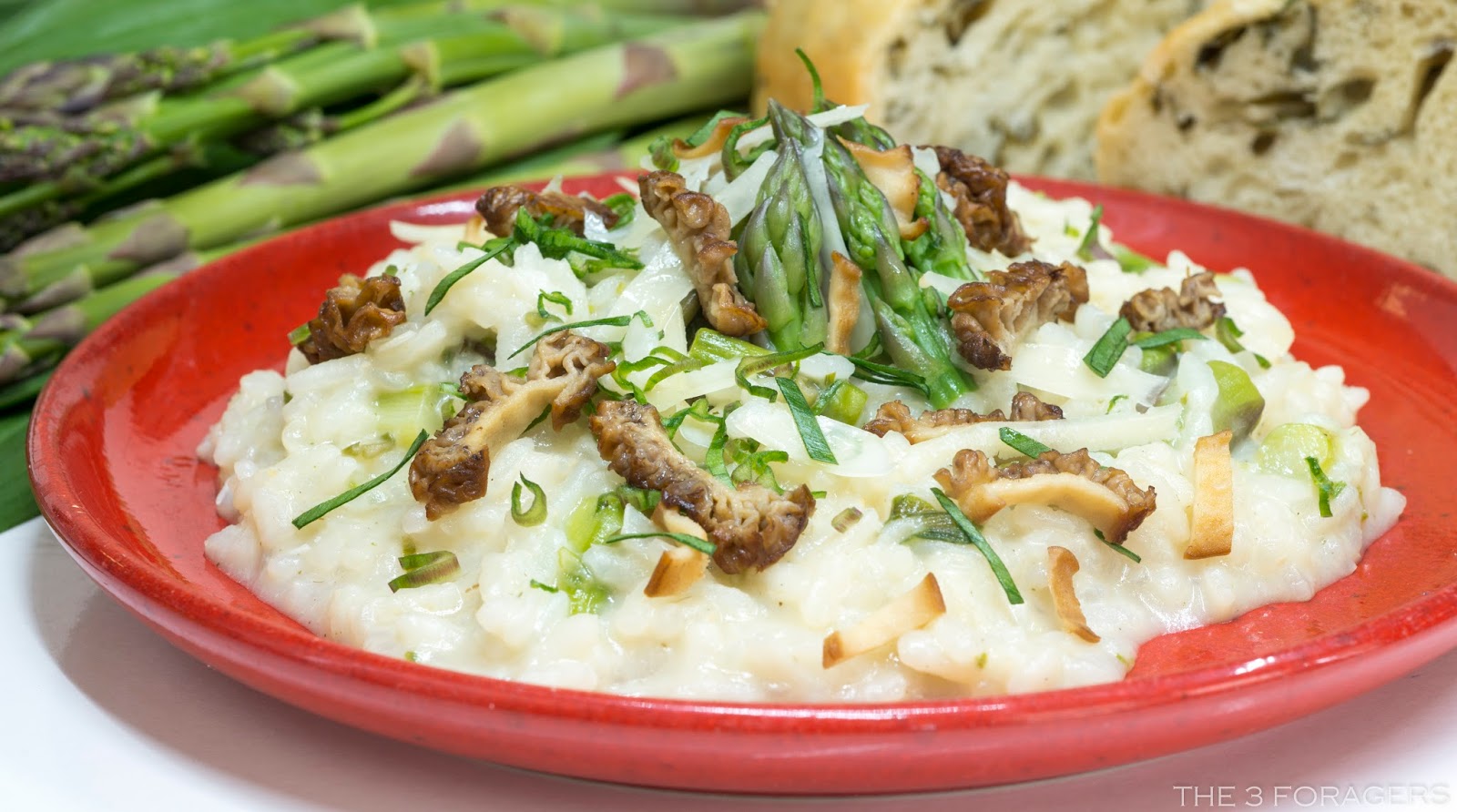 Suroviny, ingredience: 300 g rýže, 1 kg chřestu pichlavého, 1 cibule, 1 litr masového vývaru, 60 g strouhaného sýru grana, 60 g másla, extra panenský olivý olej, sůl.